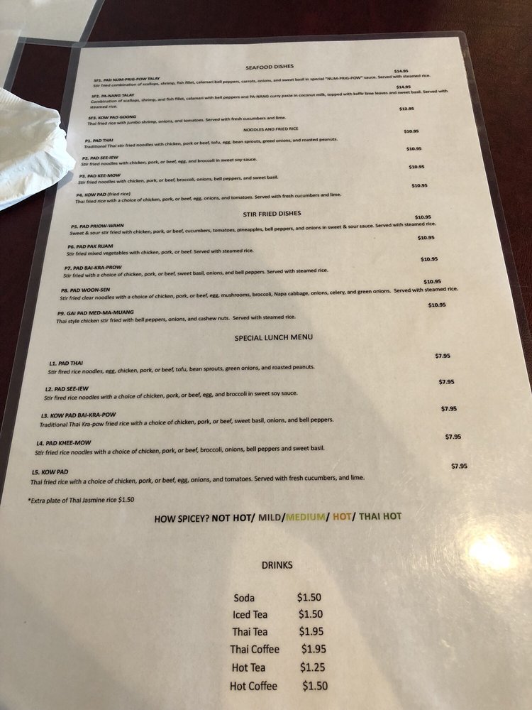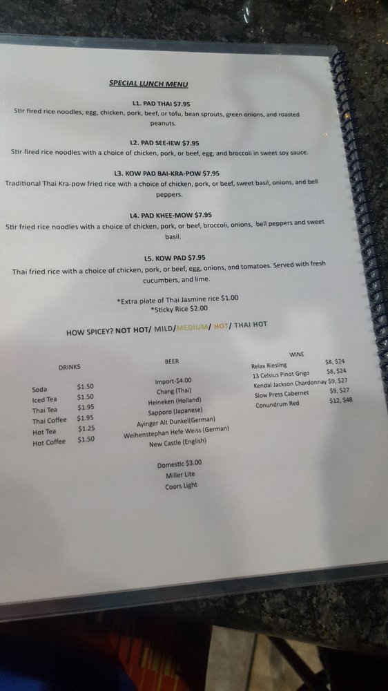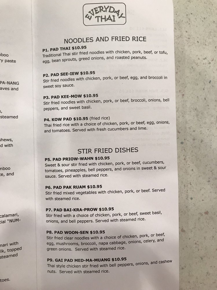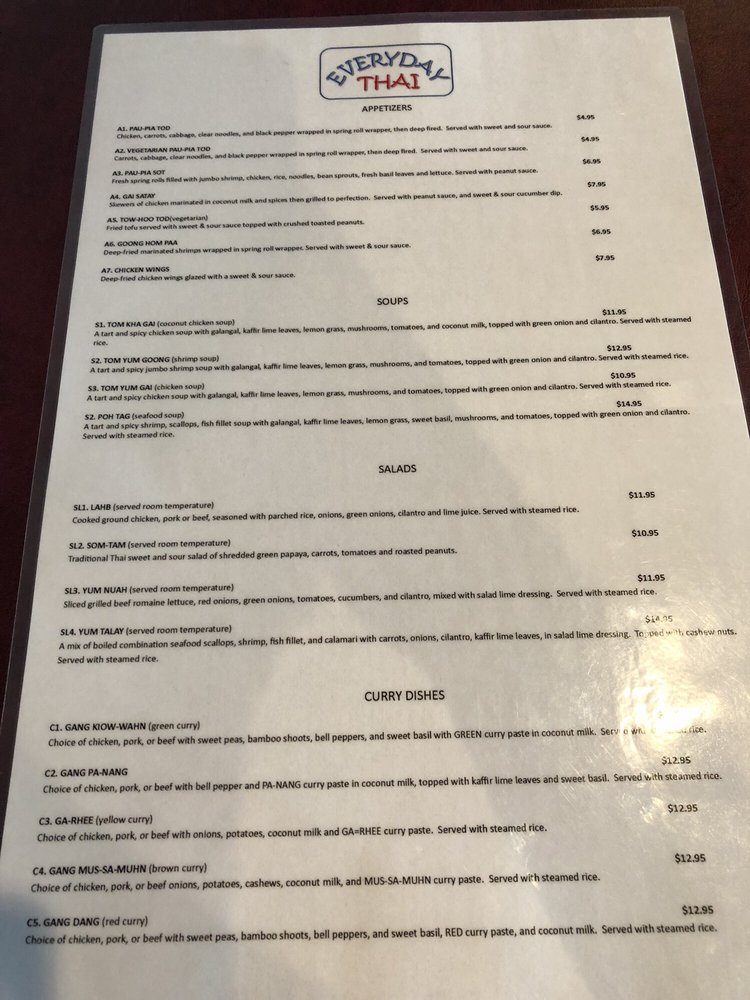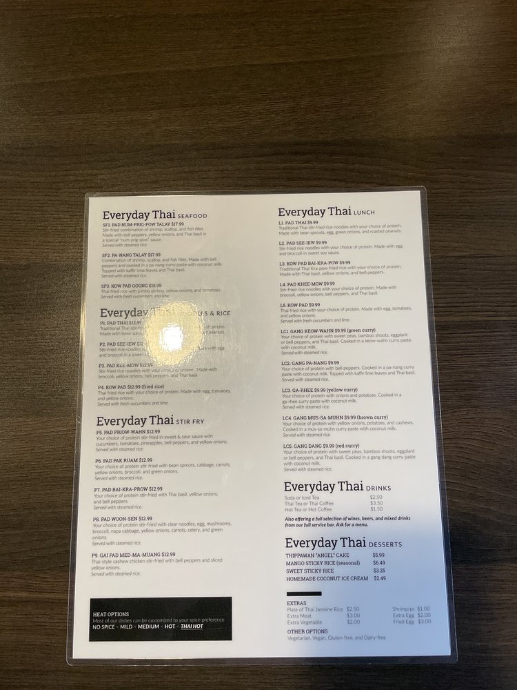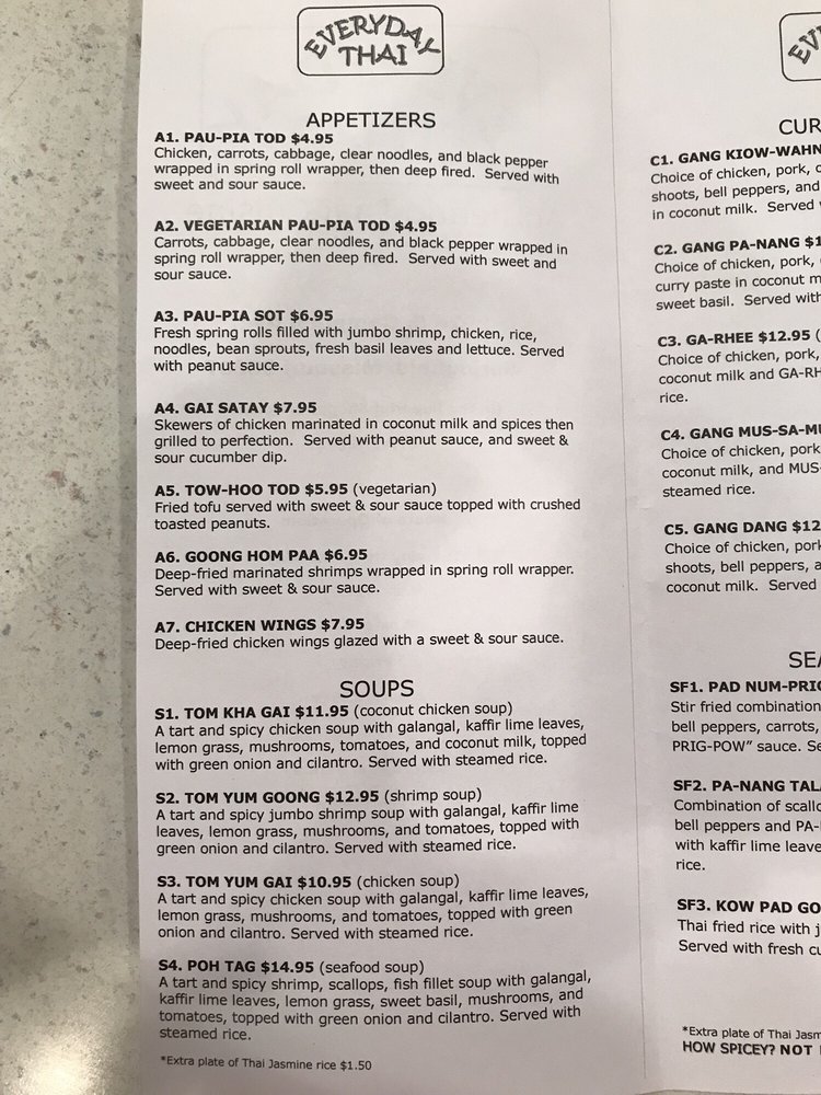 Introducing the menu at Everyday Thai, a Thai restaurant located in Springfield, MO, offering a wide range of authentic dishes with a casual dining experience. The restaurant provides a variety of vegan and vegetarian options, accepts various forms of payment, and provides amenities such as outdoor seating and free Wi-Fi. Customers rave about the flavorful dishes, generous portion sizes, and attentive service. Standout items include the Pork Pad See Ew, Red Curry, Tom Kha Gai soup, and Yellow Curry. The restaurant has garnered praise for its reasonable prices, clean environment, and quick service. With a diverse menu catering to different dietary preferences and a welcoming atmosphere, Everyday Thai is a must-visit for those looking to enjoy delicious Thai cuisine in a friendly setting.