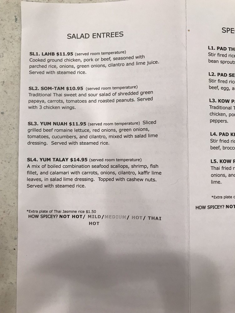 Cooked ground chicken, pork, or beef, with parched rice, red onions, green onions, cilantro, and seasoned with Thai dressing. Served with steamed rice.